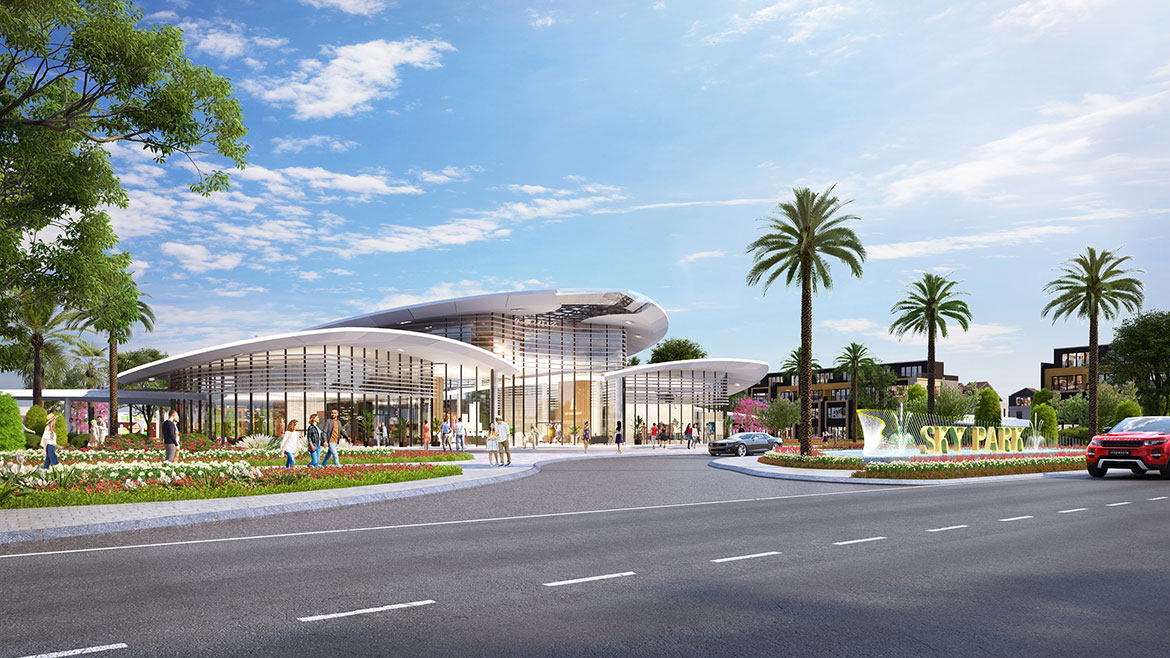 Tòa nhà điều hành hiện đại tại Sky Park lấy cảm hứng từ sân bay quốc tế Long Thành với hình ảnh cánh hoa sen cách điệu, giàu tính thẩm mỹ đón ánh mặt trời phản quang rực rỡ vào ban ngày và ánh đèn lấp lánh khi màn đêm buông xuống.
