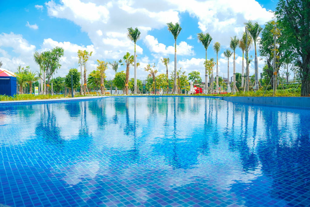 Hồ bơi tại công viên trung tâm Gem Sky Park đang trong quá trình hoàn thiện.